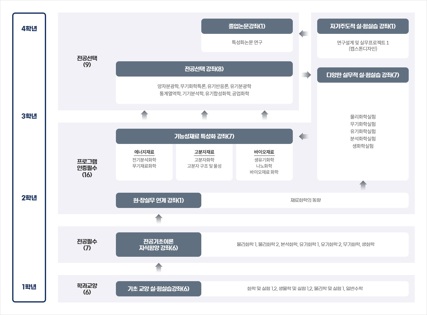 | 물리화학 | 급속도로 발전하는 물리화학분야의 새로운 지식-학문적이고 과학적인 분야로서 레이저 분광학을 비롯하여 표면 분광학분야, 생물(생체)물리학을 도입시켜 물리화학의 개념을 더욱 쉽게 이해할 수 있는 능력을 부여한다. | 물리화학Ⅰ, 물리화학Ⅱ 물리화학실험, 양자분광학 통계열역학, 물리화학특론 |